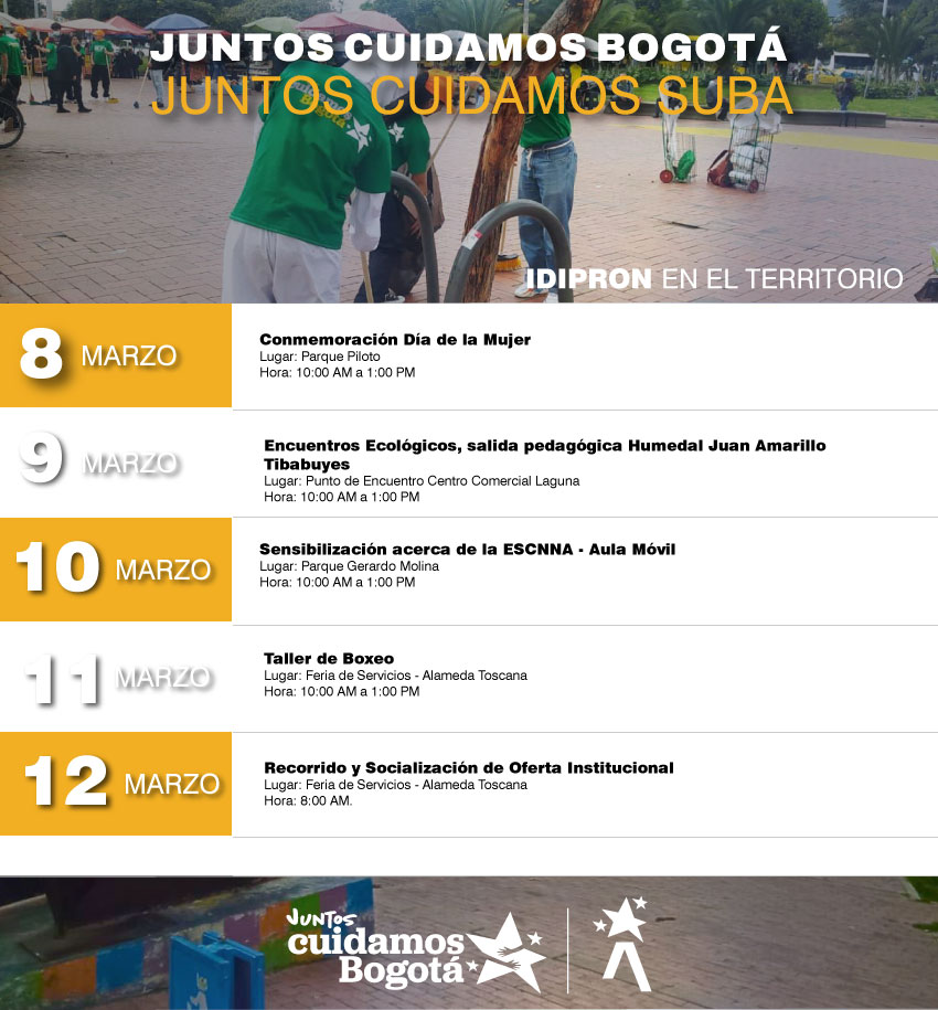 Desde el IDIPRON, continuamos con la estrategia #JuntosCuidamosBogotá. Esta semana la localidad de encuentro es Suba, en donde estaremos con los equipos de Territorio Prevención, Operación Amistad y Futuros Campeones, en charlas, prácticas lúdicas y deportivas y extendiendo nuestra oferta institucional para las niñas, niños, adolescentes y jóvenes de la localidad. #JuntosCuidamosSuba.