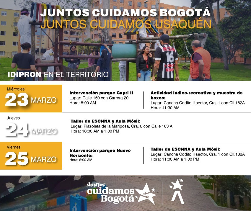 Cuatro parques renovados, jornadas deportivas de boxeo y talleres de autocuidado y prevención hacen parte de la oferta institucional que el IDIPRON lleva a Usaquén, la localidad escogida para esta semana en la estrategia #JuntosCuidamosBogotá.
