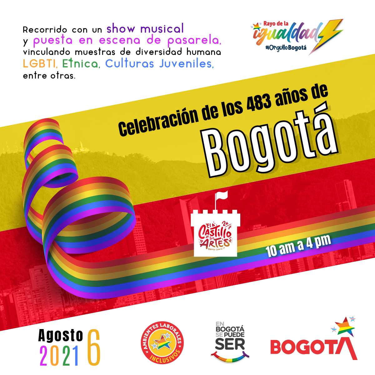 El próximo viernes 6 de agosto, en el marco del cumpleaños 483 de Bogotá, El Castillo de las Artes se llena de color y creatividad con el evento PASARELA DIVERSA. Varios grupos de jóvenes beneficiarios del IDIPRON se congregan para presentar una puesta en escena cuyo mensaje es la diversidad, la inclusión, la tolerancia y el fortalecimiento de las políticas públicas para la Comunidad Trans.