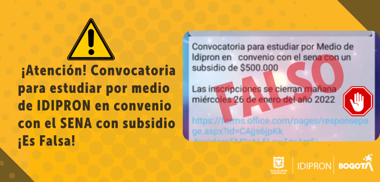 El Instituto Distrital para la Protección de la Niñez y la Juventud - IDIPRON- informa a la ciudadanía en general que está circulando un mensaje vía redes sociales y cadena de WhastApp, información sobre una supuesta convocatoria para estudiar en convenio con el SENA con un subsidio monetario de $500.000, nos permitimos alertar que esta información es FALSA y el formulario que adjuntan en el mensaje no corresponde a ninguna de las convocatorias del IDIPRON.